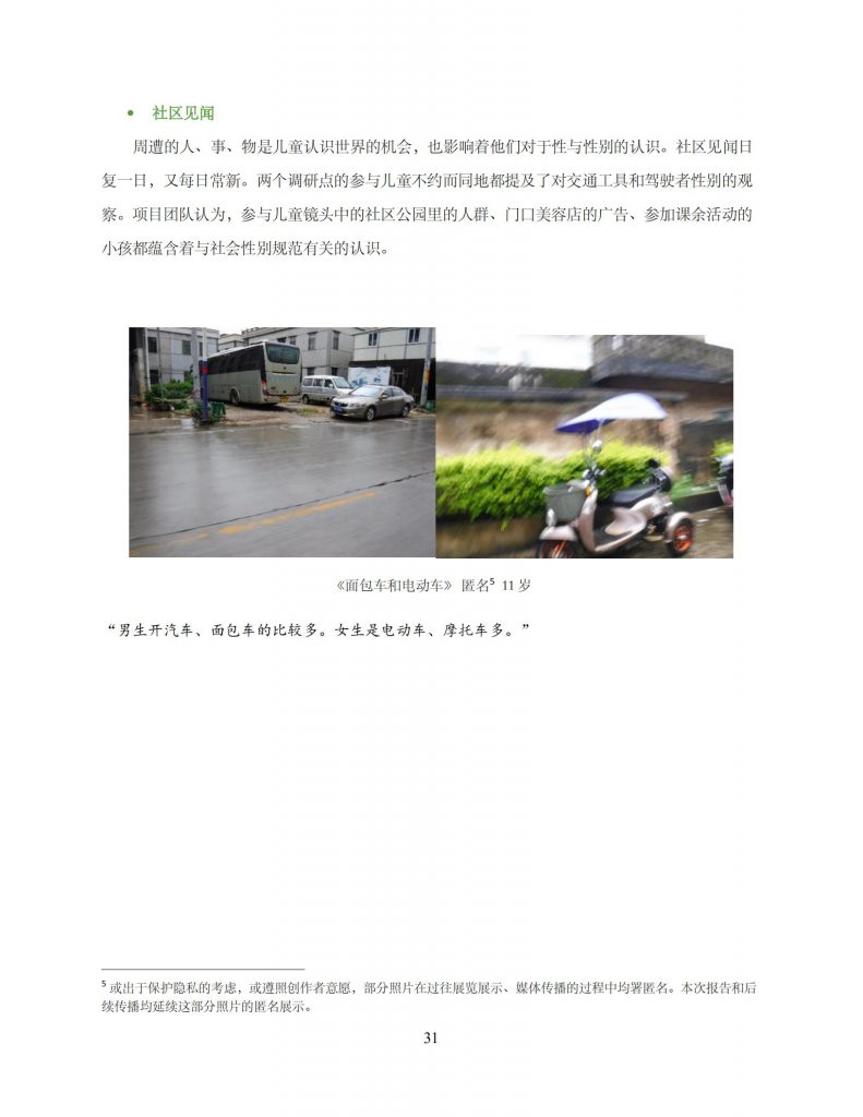 2019年,绿芽基金会与清华大学公共健康研究中心合作,在广东省的2个村庄开展儿童性教育影像发声法研究,给儿童上性教育课,请儿童拍摄日常生活中与课程有关的事物,并分享自己拍摄这些事物的原因及自己在拍摄时的思考。通过这种方式,我们尝试洞察性教育在儿童的日常生活中是如何「发生」的,并了解儿童对于性教育的看法。2020年产出研究报告《生活情境中的性教育—L 村与 H 社区儿童性教育影像发声法研究的项目报告》