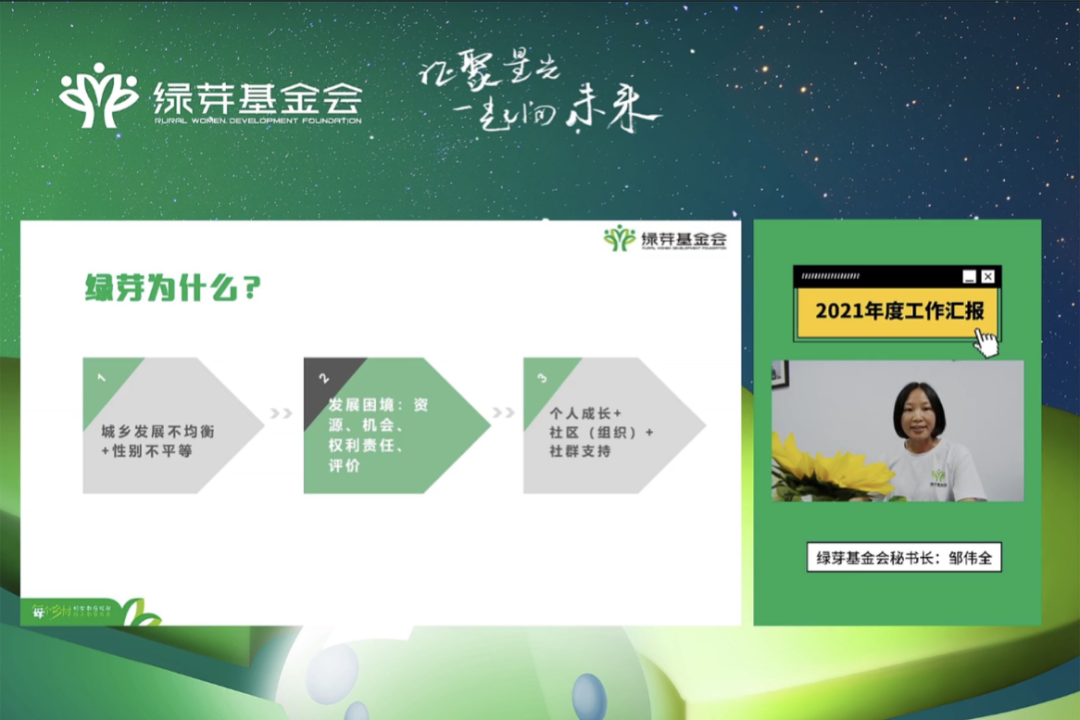 随后,秘书长邹伟全对2021年度的工作进行的总结分享。过去一年,面对疫情的纷扰,并没有消解绿芽内心的笃定。经过九年的探索以及近两年内外部环境的变化,绿芽进入了一个平稳发展的阶段。