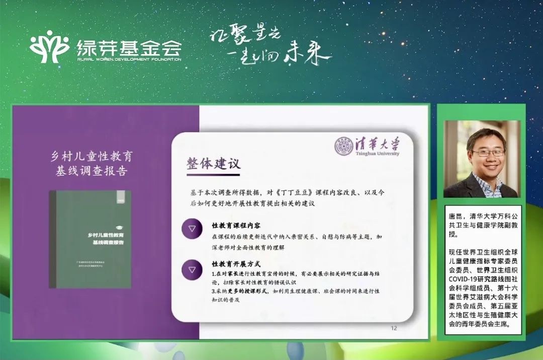 2021年,完成基线数据分析,并产出《乡村儿童性教育基线报告》,直播当天,清华大学万科公共卫生与健康学院副教授唐昆发布了此报告。