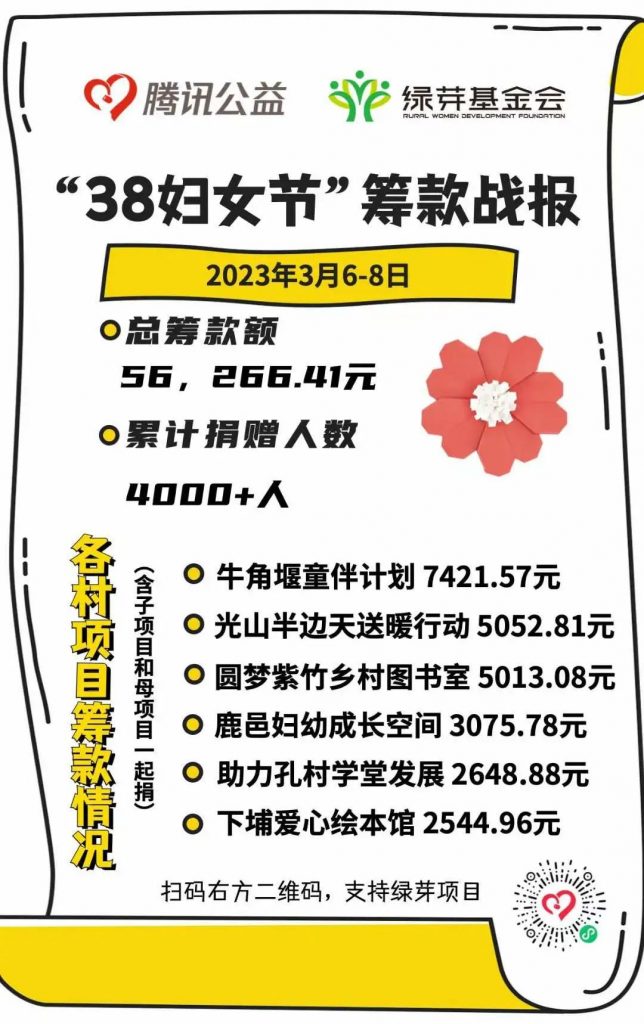 3月6日至8日,绿芽发起“38妇女节”筹款活动,为六个新招募的半乡学堂团队筹集项目资金,累计捐赠人数超过4000人,共筹得善款56266.41元。