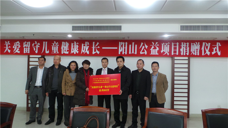 2013年12月18日上午,“关爱留守儿童健康成长”阳山公益项目捐赠仪式在阳山县政府成功举办。出席本次捐赠仪式的有广东省妇联权益部杨世强部长、阳山县李欣县长、县政府相关领导,项目资助方代表广东省信基集团董事长张汉全先生、从化国土资源局书记杨小彦女士、恒瑞无纺布公司董事长郑龙山先生、中潜达有限公司总裁罗显达先生、广州邦鑫勘测科技有限公司林小都女士、西门子(中国)袁沧州先生、广东启明科技公司总裁余希凡先生、东方宾馆营销总监佟越女士等中山大学EMBA06夏季班同学,以及广东省绿芽乡村妇女发展基金会吴治平秘书长、蔡文方理事长。