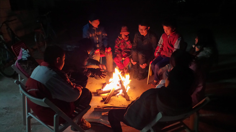 山村的冬夜,繁星满空,在绿芽的哥哥姐姐的带领下,小伙伴们聚在一起烤火、玩游戏、唱歌、分享,俨然一个小小的篝火晚会,虽然寒风刺骨,大家玩得不亦乐乎,都不想回家睡觉了呵。