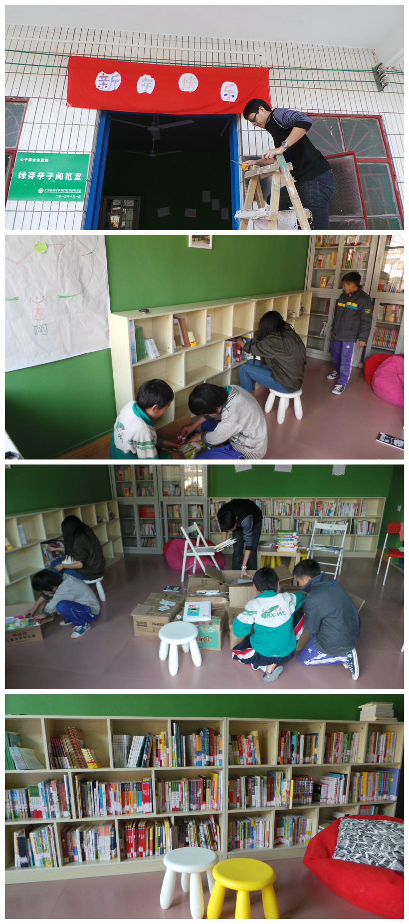2013年的12月31日,从化长流村亲子阅览室又增添了一批崭新的图书。这批300多册的亲子读物由合众创展股份有限公司捐资购买,经过祈福中英文实验学校30来名中学生义工花费一天时间的紧张整理,终于在2013年的最后一天运抵长流村。下午四点多,放学回来的长流小伙伴们,再次见到绿芽的哥哥姐姐,还有这么多新书,大家都兴奋不已,也积极地帮忙把图书整理排架。小伙伴们都热切得期待,这次又有什么好玩的活动呢?