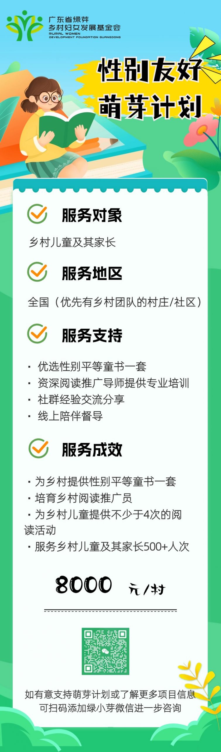 性别友好萌芽计划由广东省绿芽乡村妇女发展基金会于2022年发起,旨在通过提供优选的性别平等童书与共学课程,提升妇女骨干的性别平等意识与绘本带领经验,培育在地阅读推广团体,将阅读与性别友好的种子埋在乡村儿童的心中。本项目已经开展到第3期,服务惠及了广大的乡村儿童及家长 35000+ 人次。