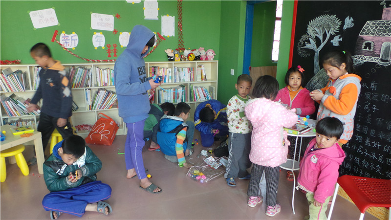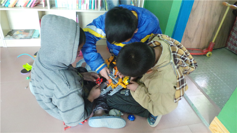 当把募捐来的玩具展示出来时,小伙伴都迫不及待地摆弄起来,个个爱不释手。大孩子小孩子一起琢磨怎么玩,小伙伴们很快就无师自通。