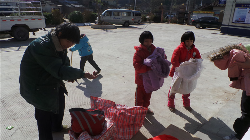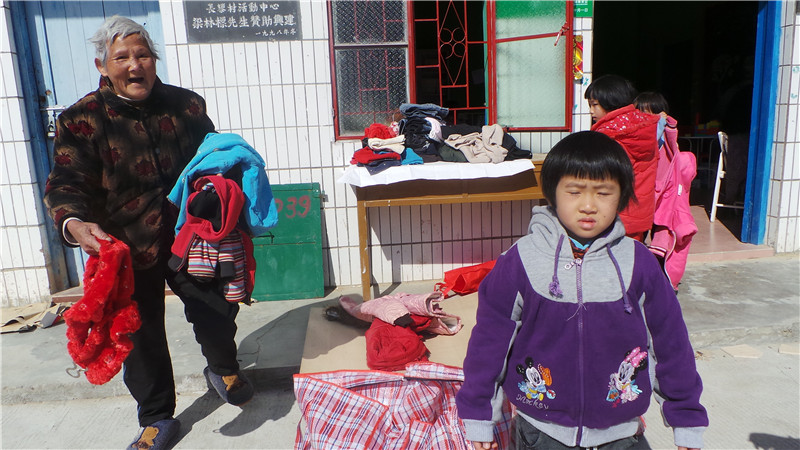第二天,又是一个阳光灿烂的日子。那边厢,村子里来了卖衣服的摊集,这边厢,小伙伴们在阅览室门口摆开了免费派送衣物的摊子。相比之下,当然是小伙伴们的摊子畅销了。大人的厚衣服很快就被挑完了,剩下的都是婴儿的衣服和夏天的衣服。小小的遗憾是,这次没有多少适合小伙伴们自己穿的厚衣服,希望下次改善。