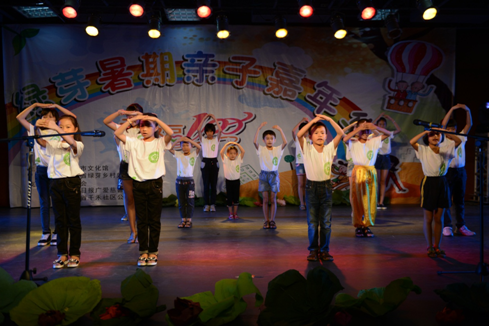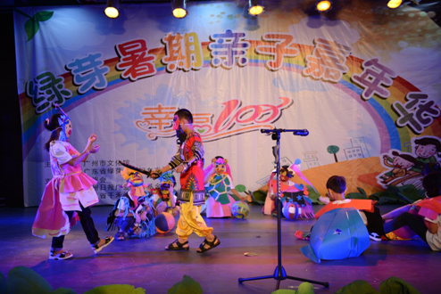 前奏结束,高潮涌现。暑期班的学员们跳舞、唱歌、演话剧,展示了暑期成长课堂的学习成果。孩子们穿上课堂上自己制作的服饰与面具为家长们呈现一幕幕精彩的演出。从古色古香的汉礼与诗经吟诵《木瓜》跨越到幽默感堪比卓别林的共融舞《采风》,从具有中国特色的儿童傩剧《钟馗抓鬼》、活泼有趣的人偶剧《独眼龙与小绵羊》过渡到优雅唯美的舞蹈《莲花开得正好》,全场高潮迭起,同时也为本次暑期课堂提交了一份满意的答卷。除了小朋友精彩的表演,广州市文化馆还带来了激情四射的花样单车表演以及调动全场观众的小丑表演。广州市第七中学的义工带来的原创钢琴表演,使得嘉年华现场动静结合,台上台下融为一片。