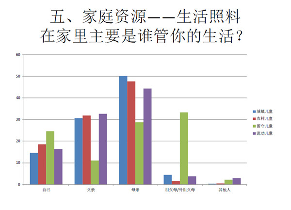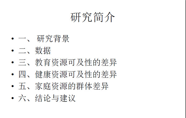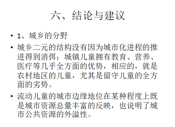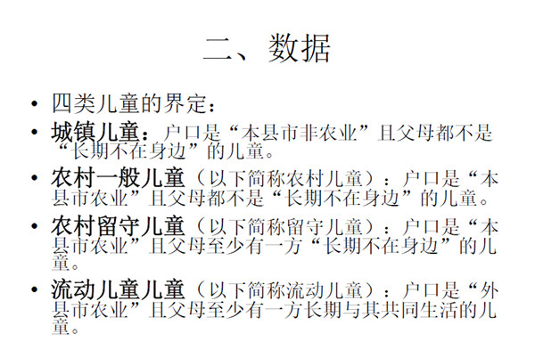 这个研究是根据2010年全国妇联在全国31个省市根据19800多个大样本的数据基础下进行分析。样本具有全国意义,这个研究在城乡二元体制机构下中国的社会资源差异是否对城乡二元体制的儿童造成影响。二元体制产生了农民以及市民的分化,进一步分化产生了城市儿童、农村儿童、流动儿童和留守儿童,公共资源的差异对他 们产生了什么影响?以下我将基于公共资源、教育资源可及性对这四类儿童产生的差异出发。