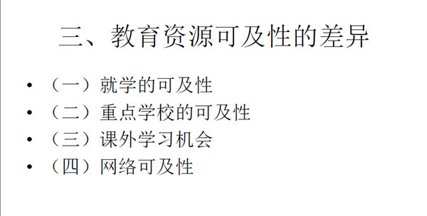 第二优质学校的可及性也呈现同样梯度的差异性。文章还提到了 现代教育方法,现代教学更多小班制、参与式,学生与老师之间有更 多互动、提问以及学生有更多机会担任班干部等。而农村学校则更多 地体现体罚以及传统教育方式。