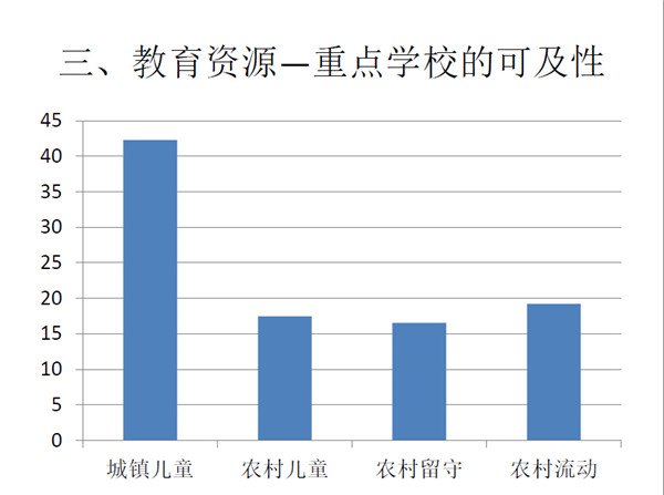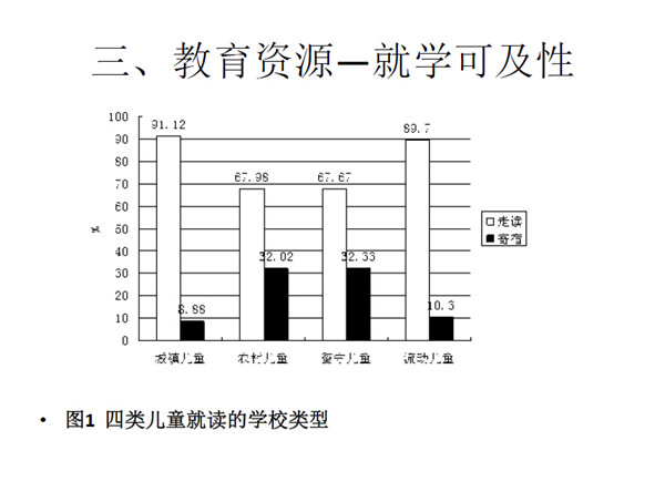 第一是儿童是否能够就近入学问题。城市儿童就近上学可及性最高,流动儿童的情况比农村儿童和城镇儿童好,这和撤点并校的影响有关。