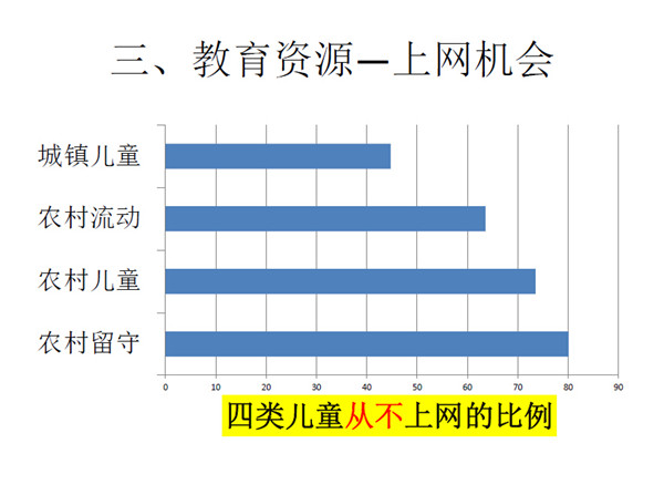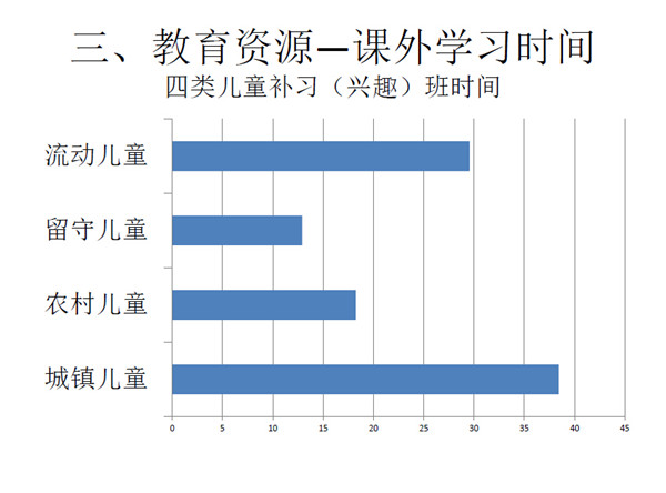 第三是课外学习时间的差异。城市儿童在就学、重点学校、现代教育可及性、课外学习以及上网资源等等都优先于其他三类儿童。而流动儿童因为城市资源的丰沛性而导致他们虽然处于边缘,但是因为丰沛性的外溢性而得到了一部分的可及性,这是我们在做所谓的公益社团产生的一个很大的作用。他们虽然没有机会参加太多兴趣班,但是可以参加社区里以及志愿者等组织的培训,流动儿童在城市里能得到一定资源。