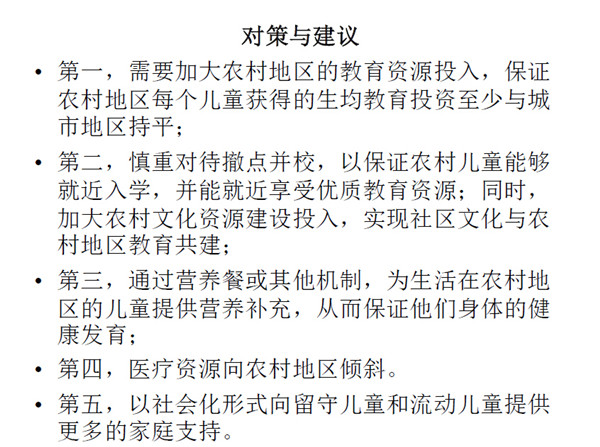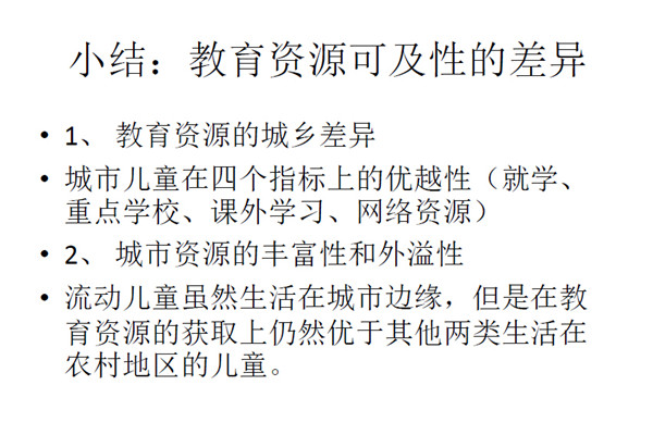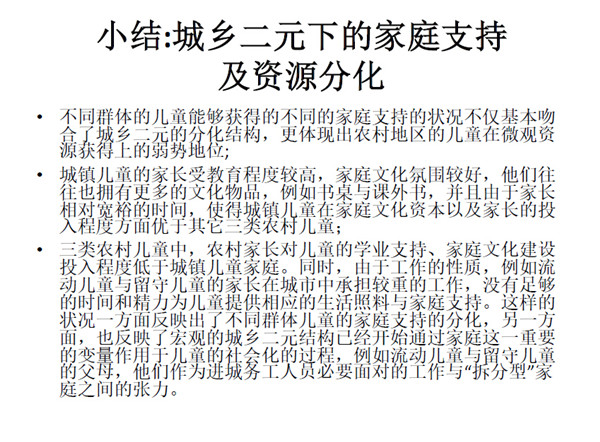 家庭资源在城乡二元体制下,流动、留守儿童家庭支持相对较弱。 在这种情况下怎么使弱势群体的儿童不被贫困的传递以及固化,怎么 使公共资源有效地往弱势群体倾斜,城乡二元体制的改需要靠宏观社 会的变化。在今天的论坛里,我认为在做的各位的努力能将现有的教 育资源不公的情况作出改善,作出倾斜。城乡二元体制带来的落差需 要社会力量的支持以及社会资源对他们的倾斜。