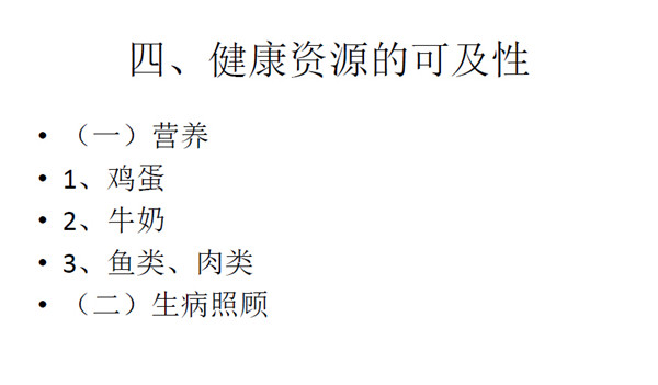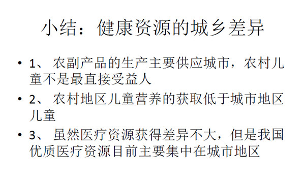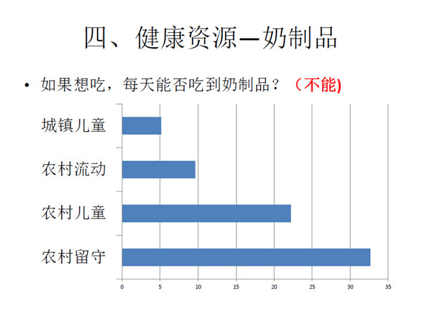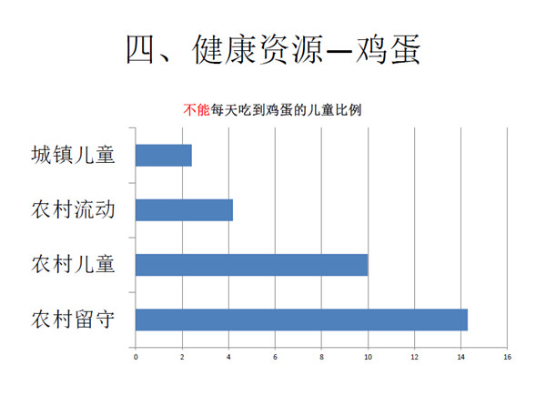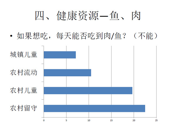 第四是健康资源部分。营养部分包括鸡蛋、牛奶、鱼类以及肉类 等。农副产品都是在农村生产,但是生产者(农村儿童)却没有获得 这些营养物品。