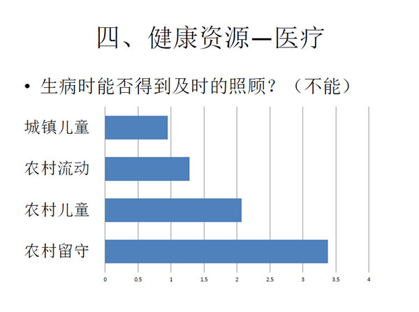 第五点,四类关于医疗资源的获得差异并不大。但是优质的医疗资源更多地集中在城市里面,而流动儿童大多只能从私人诊所或者小药房获得医疗资源,医疗资源也存在城乡二元体制的差异性。