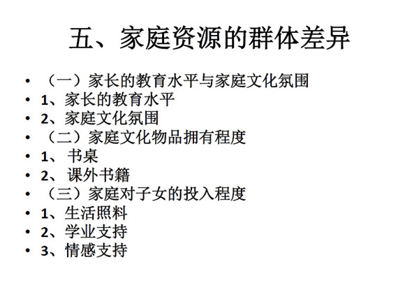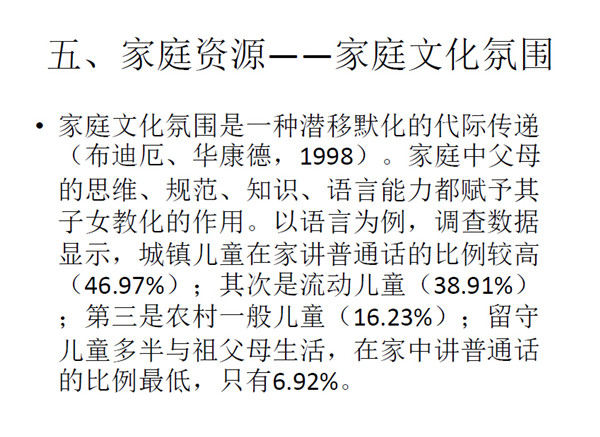 最后是关于语言部分的影响。现在学校普遍使用普通话,而如果 家庭环境中也更多地使用普通话则更利于学生在学校学习,如果家里 不说普通话那么则会削弱了儿童最初的学习能力。
