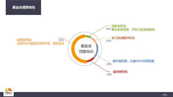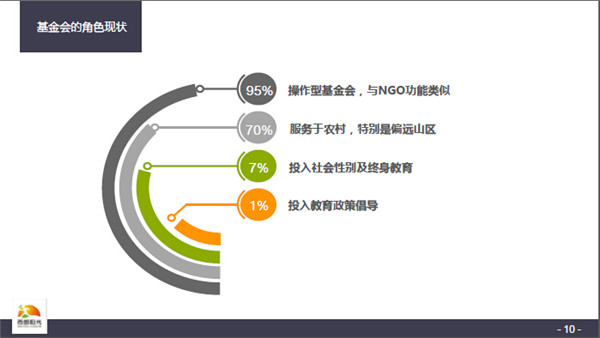 最后,关于基金会现在的情况。胡小军博士刚提到现在共有4044家基金会,去年数据展示在这些基金会当中其中 43%在做教育类工作,43%里有 40%是高校基金会,这些高校教育组织所有的资金流量占到了全国基金会的资金流量的 45.8%。可见,教育类公益组织没什么资源可用。现在的角色现状 95%是操作型的基金会,其中70%服务于农村,服务于城镇流动儿童的仍然很少。只有 7%在做社会性别和终身服务类。仅有 1%在做教育政策倡导类的活动。教育政策倡导很少,但是这正是我们需要注重的问题。基金会理想的角色,如果二三十年后能够在中国有 50%资助型基金会支持 NGO 发展,让公益生态链完整化,生态链上每一个机构都能够安稳地认真踏实做事才是最重要的。