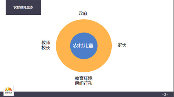 每个机构都能够理出每一家机构的教育公益生态,从工作性质、服务对象以及定义的工作角色出发都能够理出一个公益生态。我希望通过分享,所有人能够清楚知道我们工作的重点在哪,我们的重点是儿童还是教师还是硬件配置?对于西部阳光而言,教育公益组织应该 聚焦在农村儿童身上,无论是通过间接还是直接的方式。