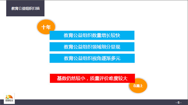 如果大家去年参与教育公益组织年会,能够从相关材料了解到最近十年里公益组织的增长很快,教育公益组织形式以及细分领域多元化,但我们仍在路上,我们的基数对于农村教育现状需求仍然十分微小。