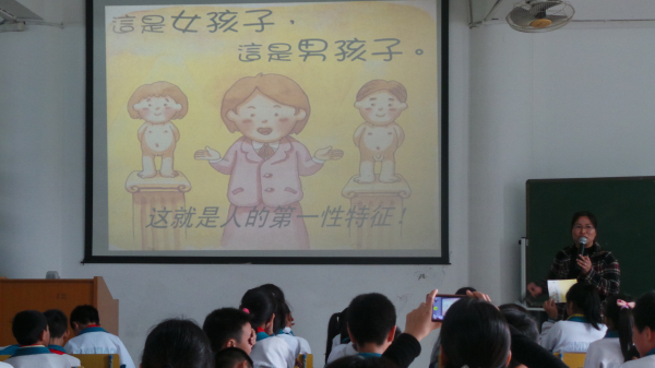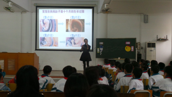 梁婵娟老师别出心裁的设计了“小威,向前冲”的游戏,让学生们亲身体验“精子和卵子”相结合的过程,演示了宝宝在妈妈肚子里10个月的成长历程,同时让学生们把书包向前背做不同难度的动作,感受“5分钟怀孕妈妈”的辛苦。示范课最后,学生们纷纷发言表达对妈妈的感恩、感谢之情,“妈妈,你辛苦了,我会努力学习,长大了让你更幸福”、“妈妈,我爱你,我会帮你实现梦想的”……学生们诚挚质朴的言词赢得了老师们的阵阵掌声。邹艳丽老师精心准备了许多教学图片,结合图片场景故事,引导学生们思考在日常的学习生活中,男生女生的各自优势、身心发展的情况,以及在人际交往中,男生女生的各自角色期待,如何理性发展异性交往。邹艳丽老师、蔡剑波老师分别结合自身的不同性别,由自身的成长体会,引导学生们学习认识在青春期发展中,男生女生的不同生理变化,如男生会发生遗精、女生会来月经等,以及如何应对自身生理的变化,克服恐慌,寻求父母、老师的帮助,健康快乐的成长。活动现场中,不少学生提问谈及自己在成长上遇到困惑,如有学生提问“月经来的多,需要吃中药吗?”、“遗精后,内裤洗不干净怎么办?”、“长痘痘了,怎么办?”面对这些由青春期发展带来的困惑,老师们一一给出解答,同时引导男生女士在公开分享中交流互动。