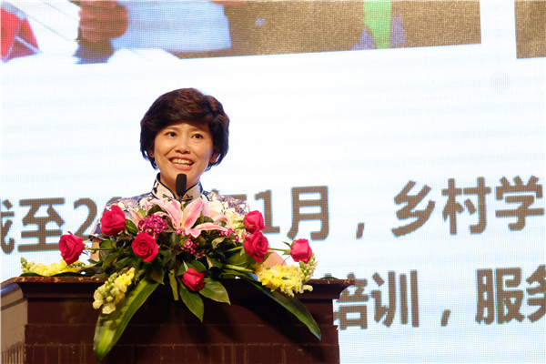 ↑ 蔡理事长在晚会现场讲述绿芽三年历程中让她印象深刻的小故事