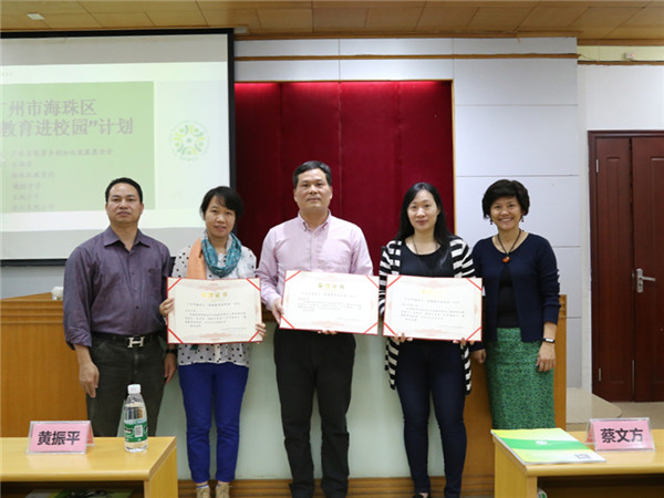 在上第一节课之前,我们举行了一个开班仪式,海珠区教育局德体卫艺科黄振平科长、晓园中学的凌俊生副书记、五凤小学肖颖珊校长以及绿芽基金会理事长蔡文方出席。
