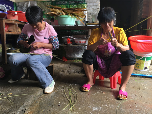 用来绑粽子的细绳由阿姨们手工制作,取一段竹子,用小刀分成一条条竹篾,慢慢从中撕取细嫩的部分,便是粽绳。
