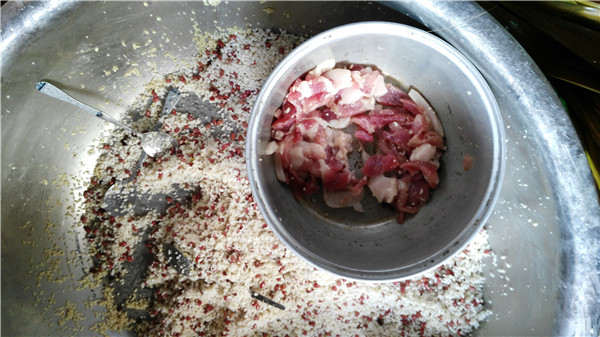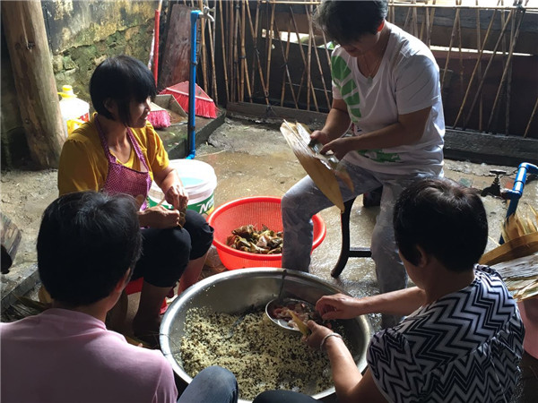 包粽子用的是当地种植的糯米,混上红豆一起浸泡,待糯米稍软,即可用来包粽子。阿姨们还会在粽子里加入猪肉,让味道更加丰富。