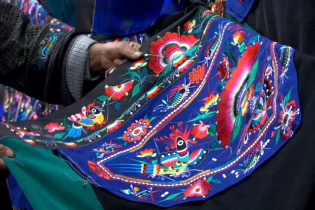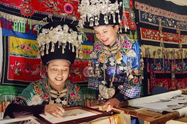 这些工艺将五千年的民族历史和个人故事通过绣品记录下来,由祖母传给母亲,再传给女儿….这些张扬灵动的苗绣作品中传递的是苗族祖先坚韧顽强的生活态度和他们对苗族文化深沉的感情。