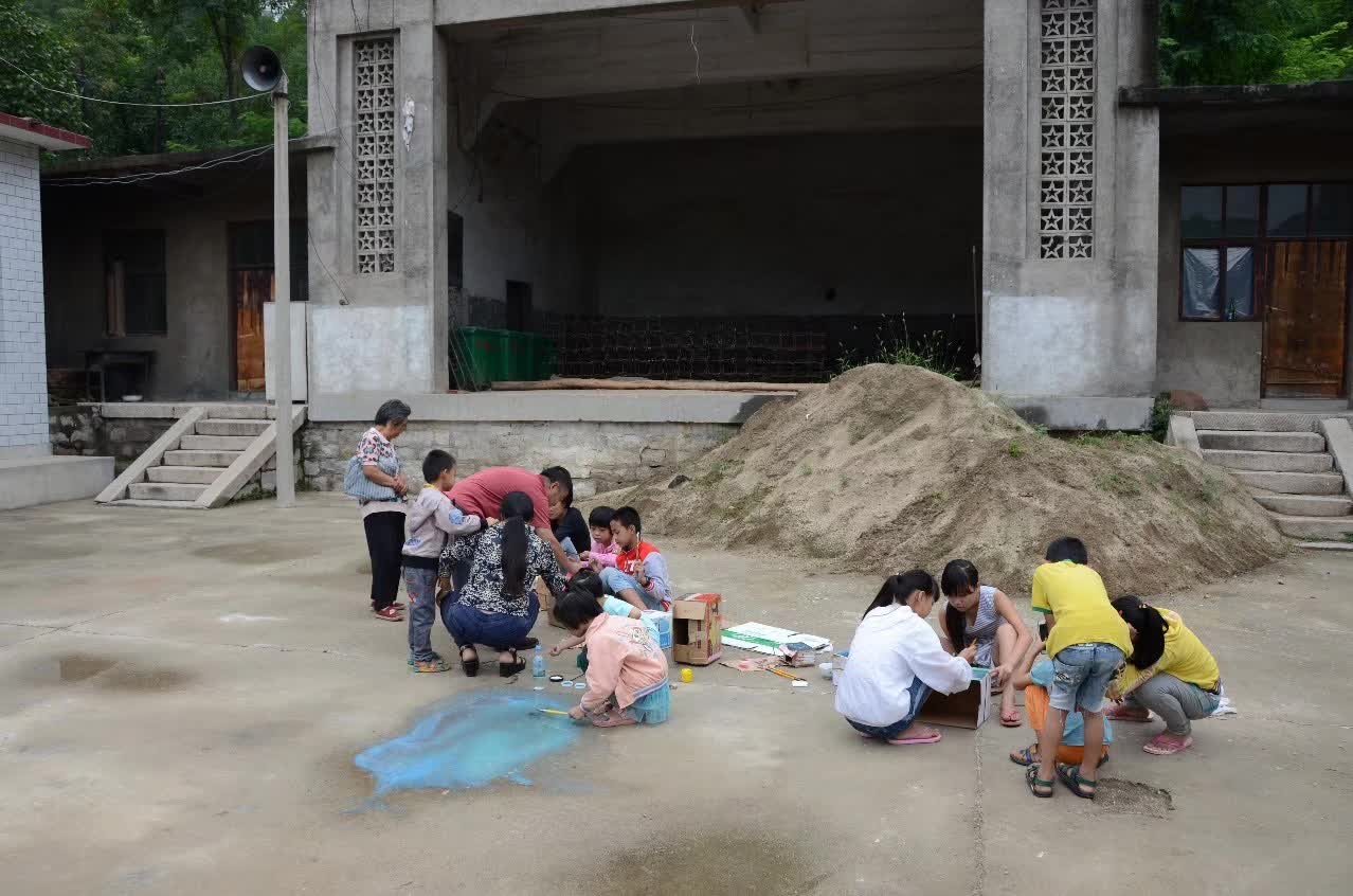 图片说明:孩子们在戏台前的空地上绘制着自己的垃圾存放箱。据老村长讲,这个见证了村里戏曲兴衰的戏台修建于1973年。如今,早已荒废的戏台已成了村民堆放杂物的场地。因为年久失修,戏台顶棚漏雨腐蚀,出于安全,孩子们也不敢到戏台里面去玩耍了。