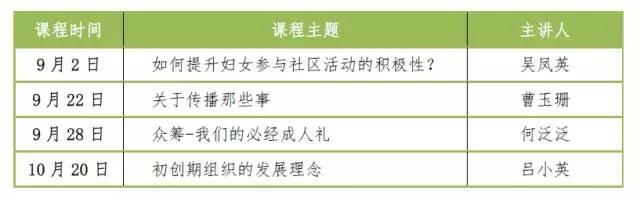 经过前期紧锣密鼓的筹备,从9月初至今,伙伴们已经举办了4次课程,具体课程见下表。