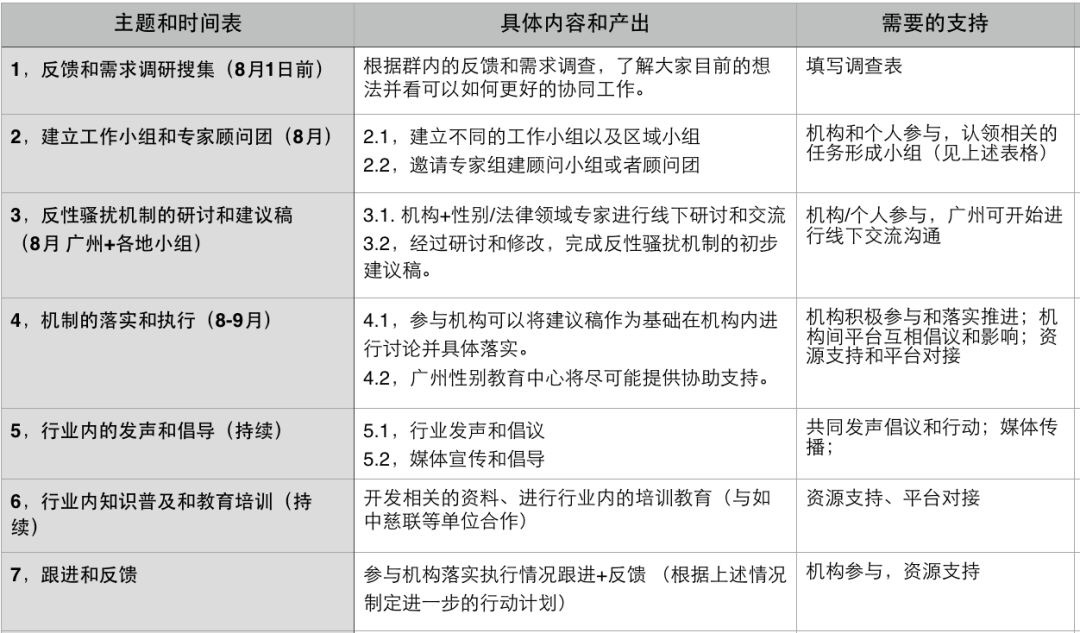 7月27日,254名来自全国各地的机构和个人参加「公益行业反性骚扰讨论会」,围绕「我可以、我愿意为行业反性骚扰机制建立做些什么」发起倡议。多家机构承诺在内部建设反性骚扰机制。8-9月,在南都基金会的支持下,广州性别中心还将进行一系列行动,推进反性骚扰机制的产出。