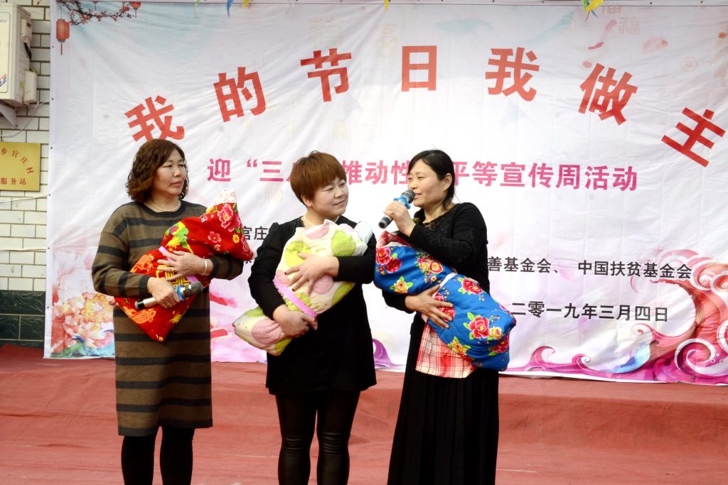 在节目表演当中,各村都带来了精彩的节目,有快板《反对家庭暴力》,三句半《推动男女性别平等》,喜剧小品《三亲家》等一系列节目,乡村姐妹们都表演得非常投入。节目表演中也穿插了男女性别平等问答题,台下观众积极参与回答问题,现场气氛非常活跃!