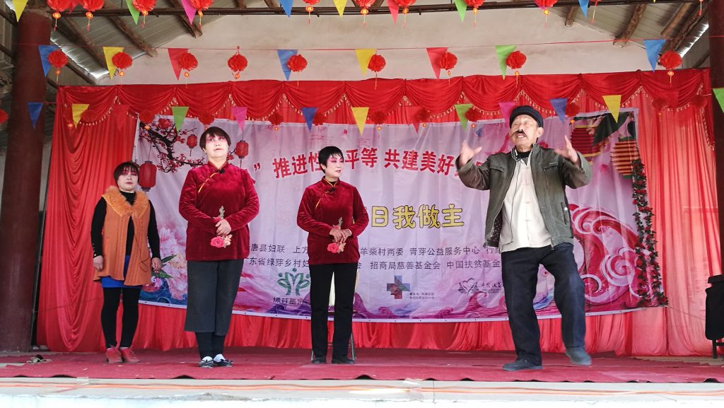 2019年3月6日,羊柴村青芽公益服务中心联合行唐县爱故乡工作站的六个爱乡会在羊柴村大队举办了“庆三八”推动性别平等文艺汇演活动。活动现场热闹非凡,共有七个村庄、108人参加了文艺汇演活动。活动中大家分别以小品、三句半,说唱快板,小戏剧等形式彰显主题——性别平等。