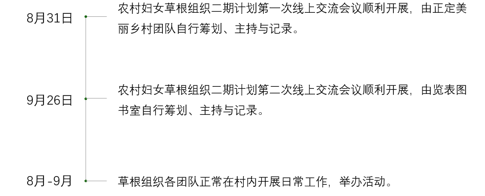 - 山西汾阳三泉农家女书社前往安徽阜阳进行参访,组织了重阳节社区节庆活动,还前往周边村庄分享经验,支持周边姐妹组织活动。